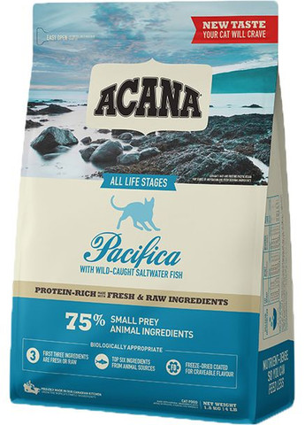 ACANA PACIFICA CAT Коты созданы потреблять рационы, обогащенные протеинами животного происхождения. Рацион, переполненный рыбой: сельдью, макрелью, камбалой, хеком и морским окунем, выловленными в дикой природе. Ингредиенты представлены в соотношении WholePrey, включая мясо рыбу, органы и съедобные кости. Формула ACANA Pacifica — это природный источник нутриентов, необходимых кошкам для хорошего самочувствия и отличного здоровья. ACANA обеспечивает вашему коту, питание, так как задумано природой. Доступные фасовки 340 гр, 1.8 кг, 4.5 кг. Пищеварительная система Наше сочетание высококачественных протеинов, натуральных источников клетчатки и смесь пробиотиков способствуют поддержанию здоровья пищеварительной системы. Здоровое сердце и зрение Таурин, ЕПК, ДГК – это жизненно необходимые нутриенты для котов, они необходимы для здоровья сердца и глаз. Здоровое функционирование кожи и шерсти Омега 3 жирные кислоты помогают поддерживать здоровье кожи и блеск шерсти. Вожделенный вкус Мясные ингредиенты в концепции Мелкая Добыча и лиофилизировання печень обеспечивают Качественные ингредиенты делают корм лучше КАК МНОГО МЯСА? 75% Мясные ингредиенты в концепции Мелкая добыча Являются мощным источником ессенциальных протеинов, витаминов и минералов КАК МНОГО СВЕЖЕГО МЯСА? 1/2 Свежее или сырое мясо птицы и рыбы Корм, переполненный нутриентами и неповторимым ароматом, которые ваш кот обязательно оценит Как много видов мяса Наши СВЕЖИЕ ингредиенты мы сохраняем путем их охлаждения. Наши сырые ингредиенты замораживаются на пике их свежести, сохраняя все необходимые нутриенты. Ингредиенты Сырая тихоокеанская сельдь (14%), сырая тихоокеанская макрель (13%), сырой цельный хек (9%), дегидратированная сельдь (8%), дегидратированная путассу (8%), дегидратированная макрель (8%), фасоль пестрая, горошек, сырая камбала, выловленная в дикой природе (5%), жир минтая (5%), цельная красная чечевица, цельный нут, цельная зеленая чечевица, сырой морской окунь (4%), подсолнечное масло, клетчатка чечевицы, лиофилизированная печень трески (1% ), высушенная ламинария, свежая тыква, свежая мускатная тыква, свежая капуста кале, свежий шпинат, свежая зелень репы, свежая морковь, свежие яблоки, свежие груши, свежая клюква, свежая черника, корень цикория, корень куркумы, расторопша, корень лопуха, лаванда , корень алтея, шиповник. ДОБАВКИ (в 1 кг): технологические: содержит природные антиоксиданты. Пищевые добавки: Холина хлорид: 1200 мг, таурин 400 мг, цинк (цинка хелат аминокислоты гидрат) 150 мг, витамин B1: 12.5 мг, витамин B2: мг, ниацин 50 мг, витамин B5 8 мг, витамин B6 6.5 мг, фолиевая кислота 0.75 мг Биотин: 0.125 мг, Витамин B12: 0.10 мг, Витамин A: 3750 МЕ, Витамин E 230 МЕ, Витамин K1: 0.5 мг, медь (меди (II) хелат аминокислоты гидрат): 11 мг, DL-метионин: 99 мг. Зоотехнические добавки: Enterococcus faecium NCIMB10415: 600x10 ^ 6 КОЕ. Энергетическая ценность: 3930 ккал/кг (472 ккал в мерном стакане 250 мл / 120 г) где источником 38% является протеин, 23% энергии поступает из углеводов и 39% из жира. Гарантированный анализ: Сырой протеин (мин.): 37% Жир (мин.): 18% Клетчатка (макс.): 3% Влажность (макс.): 10% Кальций (мин.): 1.2% Фосфор (мин.): 0.9% Зола (макс.): 9% Омега-6: 2% Омега-3: 2.2% ЭПК (мин.): 2% ДГК (мин.): 1% Таурин (мин.): 0.1% Магний (макс.): 0.1% Котятам: после отлучения (приблизительно 5 недель) суточная норма корма составляет 1/2 мерного стакана (60 г) на 1 кг массы тела; с 20-недельного возраста (приблизительно с
