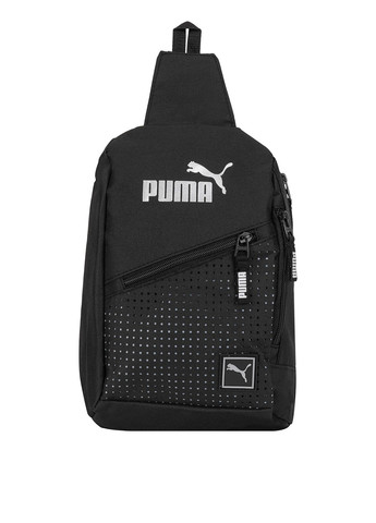Сумка-слинг Puma. Сумка-слинг Puma — идеальный вариант для активного отдыха. Сумка с одним отделением на молнии. Молния находится сбоку. Есть подкладка. Спереди два кармана на молнии. Один из передних карманов с перфорацией. Уплотненная спинка. Регулирующий текстильный ремешок, который можно перестегнуть на другую сторону с помощью карабина. Сверху есть петелька, для того чтобы вешать сумку на вешалку. Прорезиненный логотип бренда на внешнем кармане. Принт логотипа бренда спереди. Отличное качество. Размер: 20х30,5х6,5 см.