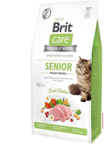 Описание Brit Care (Брит Кеа) Cat GF Senior Weight Control для кошек старше 7 лет, для поддержания веса Гипоаллергенный беззерновой корм для кошек старше 7 лет Brit Care Cat Grain Free Senior Weight Control – полнорационный, сбалансированный корм суперпремиум класса на основе деликатного свежего мяса курицы для пожилых кошек, а также для стерилизованных пожилых питомцев. Корм помогает поддерживать хорошую физическую форму и обеспечивает здоровье всего организма кошек. Преимущества корма Brit Care Cat Grain Free Senior Weight Control: Свежее мясо курицы обладает диетическими качествами и обеспечивает хорошее состояние пищеварительной системы. Небольшое содержание жира и большое количество клетчатки помогает пищеварению и предотвращает набор лишнего веса. Пробиотики и пребиотики поддерживают иммунную систему и способствуют здоровью кишечника. Облепиха и настурция обеспечивают здоровье почек и мочевыводящей системы. Небольшое содержание магния и L-метионина поддерживает необходимый pH мочи (на уровне 6,0-6,5). Настурция обладает сильными природными антибактериальными и антисептическими свойствами. Препятствует появлению камней в почках стерилизованных кошек Натуральные антиоксиданты содержатся в экстрактах розмарина и токоферола из растительных масел В составе таурин – аминокислота, обеспечивающая хорошее зрение и здоровье сердца Подходит для пожилых кошек и стерилизованных летних кошек Не содержит зерновые, красители, консерванты, сою и ГМО Состав: дегидрированная курица (27%), свежее мясо курицы (26%), горох желтый (22%), сушеные яблоки (9%), куриный жир (консервированный токоферолами, 4%), пивные дрожжи (3%), псилиум - половая и семена (2%), лососевое масло (2%), гидролизованная куриная печень (2%), семена льна (1%), сушеная настурция (0,5%), сушеная ромашка (0,5%), минералы, сушеная облепиха (0,3%), сушеная брусника (0,2%), фруктоолигосахариды (0,015%), маннанолигосахариды (0,015%), юкка Шидигера (0,008%), Lactobacillus acidophilus1 ). Питательный состав: витамин A – 20000 МЕ, витамин D3 – 800 МЕ, витамин E – 600 мг, витамин C – 300 мг, таурин – 2500 мг, L-карнитин – 50 мг, холина хлорид – 2500 мг, биотин (3a880) – 2 мг, витамин B1 (3a821) – 10 мг, витамин B2 – 12 мг, ниацинамид – 50 мг, D-пантотенат кальция – 40 мг, витамин B6 – 10 мг, фолиевая кислота – 2 мг, витамин B12 – 0,04 мг , цинк – 120 мг, железо – 45 мг, марганец – 55 мг, йодид калия – 4 мг, медь – 10 мг, селен – 0,2 мг, L-метионин – 2000 мг. Содержит натуральные антиоксиданты, одобренные ЕС: экстракты токоферола из растительных масел (1b306), аскорбил пальмитат (1b304) и экстракт розмарина. Энергетическая ценность: 3650 ккал/кг