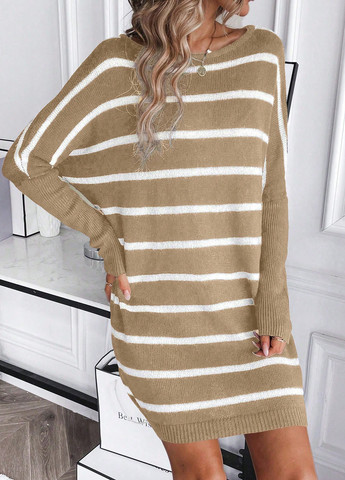 Свободное платье-свитер с полосатым узором, свободного кроя, круглым вырезом и длинными рукавами. Рукава «летучая мышь» придают изделию уникальный вид, а слегка эластичная ткань обеспечивает комфорт. Платье с естественной талией подходит для повседневной носки.
