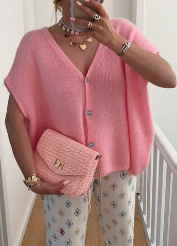 Женский свободный прозрачный кардиган. Этот вязаный свитер имеет рукава «летучая мышь» и V-образный вырез. Ткань слегка тянется. Включает пуговицы для застежки. Карманов нет. Изделие подчеркивает мягкость.
