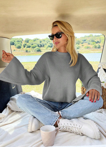 Женский укороченный свитер оверсайз с рукавами-колокольчиками. Этот свитер имеет облегающий крой и отделку в рубчик. У него спущенные плечи и круглый вырез. Ткань обладает средней эластичностью. Подол имеет правильную форму.