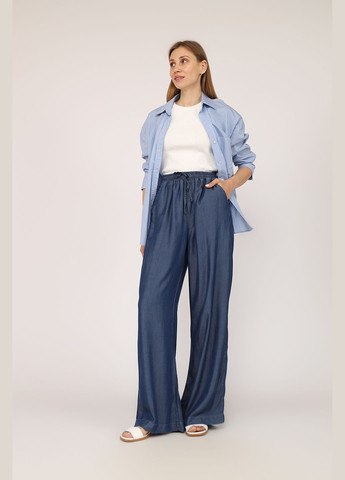 Штаны палаццо женские – это элегантный и комфортный элемент гардероба, придающий образу легкость и изысканность. Их свободный крой создает непринужденный силуэт, позволяя чувствовать себя раскованно в любой ситуации. Мягкая, струящаяся ткань нежно облегает фигуру, подчеркивая стиль и изящество. Такие штаны идеально сочетаются с топами, блузами или объемными свитерами, создавая как повседневные, так и более изысканные образы. Широкий фасон добавляет нотку свободы и актуальности, делая их must-have для современного гардероба. Женские широкие щтаны – это гармония удобства, трендового дизайна и универсальности для любого случая! Особенности изделия: Цвет: синий, однотонный. Материал изготовления: Состав: 100% хлопок. Модель: палаццо. Посадка: средняя. Размерный ряд: S - XL. Сезон: демисезон. Параметры модели: Рост: 170 сантиметров. Размер на модели: М, украинский размер: 46. Страна производитель: Турция. Размер на бирке S / Украинский размер 44 Размер на бирке M / Украинский размер 46 Размер на бирке L / Украинский размер 48 Размер на бирке XL / Украинский размер 50
