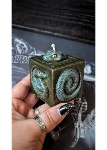 "О, ты ведь не думал, что свечи бывают обычные?" Эта — как прямой канал ко всем ползущим во тьме силам и шепчущим с дымом. Череп, держащийся на змее, — символ знания, смерти, циклов и... немного безумия (в лучшем смысле). Воск - пчелиный, дух - шаманский, стиль - апокалиптически-сакральный."