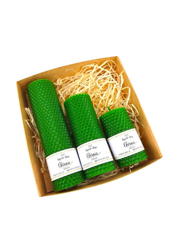 Набор свеч в коробке 18*18*6 см. Свечи ручной работы, изготовленные из цветной вощины разной длины: 8.5 см, 13 см, 17.5 см. Прекрасно подойдет как интерьерный декор. Благодаря тому, что свечи изготовлены из натурального пчелиного воска, Вы можете использовать их в закрытых помещениях, не опасаясь за свое здоровье. Цвет – оливковый.