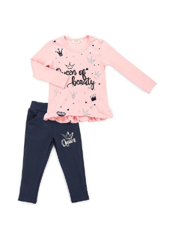 Очень классный, модный комплект для девочки в спортивном стиле из тонкого, хлопкового турецкого трикотажа, очень приятного на ощупь. Состоит: из нежно-розового лонгслива и темно-синих брюк.
