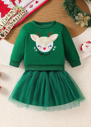 Ансамбль состоит из зеленого свитшота и пышной юбки из тюлевой сетки. Свитшот украшен вышивкой в виде оленей. Ткань слегка эластичная. Он создан как праздничный костюм.