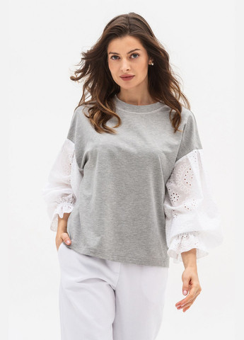 Свитшот свободного, прямого кроя с оригинальными рукавами из прошвы. Модель имеет спущенное плечо, округлый вырез, широкие рукава прибраны на резинке. Прошва представляет собой разновидность кружева, 100% натуральная ткань с вытканой вышивкой-перфорацией.