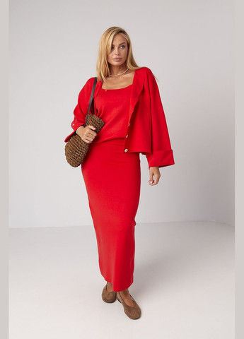 Женский юбочный костюм классического фасона. Изготовлен из плотного трикотажа, который имеет вязаную текстуру. Ткань имеет небольшую эластичность. Костюм состоит из жакета безрукавки и юбки-карандаш. Жакет безрукавка прямого фасона, без застежек и без карманов. Имеет небольшой V-образный разрез воротника. Юбка-карандаш с талией на резинке без застежек, по бокам два вшитых кармана. Классический костюм, идеальный вариант для делового образа.