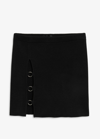 Короткая черная юбка из тонкого вязаного трикотажа с широким эластичным поясом, боковым разрезом и деталями кольца. Облегает фигуру. Ширина талии в размере S –70 см, длина – 36 см.