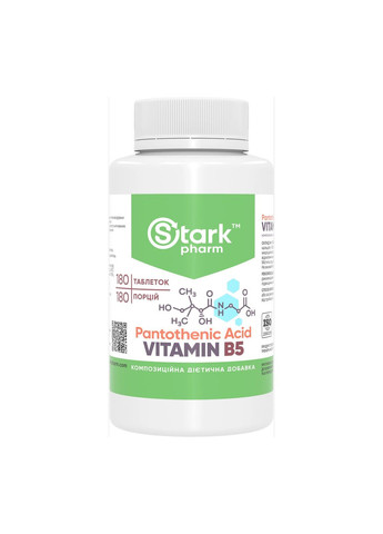 Штрихкод : 4829888053153 Диетическая добавка Stark Pharm – Stark Pantothenic Acid Vitamin B5 содержит витамин B5 (или пантотеновую кислоту), который играет важную роль во многих процессах в организме, включая участие в метаболизме белков, жиров и углеводов и выработке энергии, необходимой для нормального функционирования организма. Витамин B5 – важный водорастворимый витамин группы B, его основная функция заключается в синтезе коэнзима А (KoA), который необходим организму для синтеза и расщепления жирных кислот, переноса ацетильных и ацильных групп, а также протекание большого количества других анаболических и катаболических процессов в организме. Кроме того, пантотеновая кислота является важным питательным веществом для поддержания здоровья кожи, волос и ногтей, способствуя восстановлению тканей и заживлению ран. Добавки пантотеновой кислоты могут быть полезны для кожи, помогая улучшить ее общее состояние, и особенно эффективны в борьбе с акне. Благодаря своим увлажняющим и заживляющим свойствам витамин B5 (пантотеновая кислота) является эффективным помощником в уменьшении воспаления и улучшении барьерной функции кожи. Положительное влияние пантотеновой кислоты на волосы обусловлено ее способностью регулировать синтез гормонов стресса в коре надпочечников, тем самым предотвращая негативное влияние стрессовых факторов, которые могут негативно сказаться на состоянии волос. Витамин B5 играет важную роль в формировании антител, способствующих укреплению иммунитета, усвоению других витаминов и участию в синтезе нейромедиаторов. Пантотеновая кислота также необходима для нормализации окислительно-восстановительных процессов, обеспечения нормальной работы мозга. Прием добавок витамина B5 запускает в организме процесс липолиза, то есть высвобождение и сжигание жиров, что способствует выработке дополнительной энергии, крайне необходимой организму для работы в условиях повышенной физической и умственной нагрузки. Действие добавки: Поддержание метаболических процессов, ускорение метаболизма Укрепление местного иммунитета Содействие регенерации тканей кожи и слизистых оболочек Повышение тонуса кожи, поддержание ее увлажнения и эластичности. Мощное противовоспалительное действие, устраняющее покраснение Улучшение устойчивости организма к стрессу Усиление ухода за антивозрастной деятельностью Способ использования: Взрослые: 1 таблетка каждый день или по назначению врача. Принимать с едой или без нее, запивая стаканом воды.