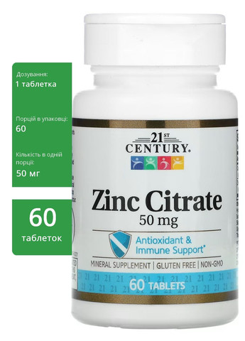 Цинк в форме цитрата, способствует лучшему усвоению организмом. Эффективен в укреплении иммунитета, особенно в осенне-зимний период, а также оказывает положительное влияние на рост волос и состояние кожи. Рекомендуется в качестве профилактического средства от вирусных инфекций. Цинк — важный минерал, который обладает антиоксидантными свойствами и поддерживает работу иммунной системы. Рекомендации по применению В качестве минеральной добавки для взрослых принимать по одной (1) таблетке в день во время любого приема пищи или в соответствии с назначением врача. Не следует превышать рекомендованную дозировку. Результаты зависят от индивидуальных особенностей организма. Размер порции: 1 таблетка Количество в 1 порции Кальций (в виде дикальций фосфата) 46 мг Цинк (в виде цитрата цинка) 50 мг Предупреждения Перед началом применения продукта во время беременности, кормления грудью, приема лекарств, при наличии заболеваний или планировании медицинских процедур необходимо проконсультироваться с врачом. При возникновении побочных реакций следует прекратить прием и обратиться к врачу. Хранить в недоступном для детей месте.