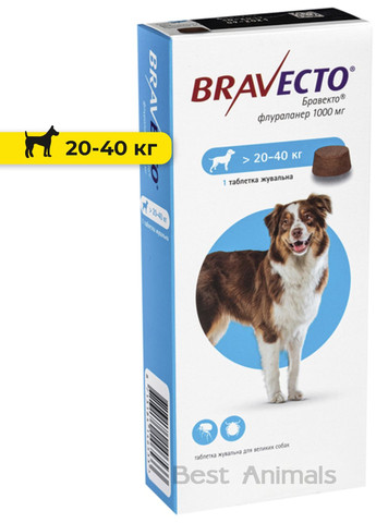 Противоразитарные жевательные таблетки Бравекто для собак – специальный препарат для защиты питомца от иксодовых клещей и блох, который разработан в виде таблеток, имеющих аппетитный вкус и запах. Препарат Bravecto by MSD Animal Health – Bravecto Chewable Tablets For Dogs обладает широким спектром действия, обеспечивая защитную функцию всего организма на длительный период времени (около 12 недель). Преимущества: Полная защита на целый год от блох всего за четыре приема, означает меньшее количество процедур. Отличная защита от паразитирующих насекомых на каждый сезон. С Бравекто Вы можете быть спокойны за Вашу собаку, она защищена в течение 12 недель от блох и клещей с помощью одной дозы. Таблетка вкусная, легко разжевывается. Воспитанника не нужно купать, так что Вы можете бороться с паразитами без неприятных процедур и не бояться, что он слижет препарат или запачкает им мебель или ковер. Состав: Флураланер (4-[5-(3,5-дихлорфенил)-5-(трифторметил)-4Н-изоксазол-3-ил]-2-метил-N-[2-оксо-2-(2,2,2-трифторэтиламино) этил] бензамид) - инсектоакарицид группы изоксазол. Вспомогательные вещества: - ароматизатор "Super Premium in Powder for Dog" - 20%, - сахароза - 7%, - натриюлаурилсульфат - 2%, - динатрия памоат моногидрат - 2%, - стеарат магния - 0,75%, - аспартам - 0,25%, 0,1% бутилокситолуол) – 12,3%, – полиэтиленгликоль – 18,5%, – кукурузный крахмал – 16,06%. Фармакологические свойства: бравекто относится к инсектоакарицидным лекарственным препаратам системного действия. Действующее вещество, в 1 таблетке Флураланер: 1000 мг для собак массой >20 – 40 кг. Лекарственная форма: жевательные таблетки. Показания к применению: Бравекто назначают собакам с целью профилактики и лечения акарозы, вызываемых иксодовыми клещами (Ixodes ricinus, Ixodes hexagonus, Ixodes scapularis, Ixodes holocyclus, Dermacentor reticulatus, Dermacentor variabilis и Rhipicephalus sangu). Препарат назначают с целью снижения риска заболевания бабезиозом, переданным иксодовыми клещами, инфицированными Babesia canis. Препарат назначают с целью профилактики и лечения вызываемой блохами энтомозы (Ctenocephalides felis и Ctenocephalides canis). Бравекто назначают при комплексной терапии аллергического дерматита, вызываемого блохами. Препарат назначают для предотвращения заражения дипилидиозом, передаваемым блохами, инфицированными личинками гельминта Dipylidium caninum. Бравект назначают для лечения демодекоза, вызванного Demodex canis. Препарат назначают для лечения чесотки, вызванной Sarcoptes scabiei. Разломка таблеток не допускается: следует убедиться в том, что собака полностью проглотила необходимую дозу препарата. Противопоказания: производители препарата указывают на наличие следующих противопоказаний: возраст щенка менее 2 месяцев, наличие индивидуальной непереносимости, наличие хронических заболеваний органов пищеварения. Побочные эффекты: производителем заявлена информация об отсутствии выявленных побочных эффектов при действии препарата, а точнее практически не наблюдаются. Форма выпуска: бравекто выпускают в форме жевательных таблеток, которые упаковывают по 1 штуке в запаянные блистеры из алюминиевой фольги. Срок годности: срок годности в упаковке производителя при соблюдении условий хранения – 2 года с даты производства. Условия хранения: бравекто хранят при температуре не выше 30 °С. Наименование бренда: Bravecto (Бравекто)