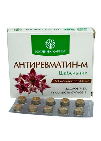 Антиревматин – M (60 табл.) Антиревматин – M от Растение Карпат – это эффективное натуральное средство, которое помогает улучшить состояние суставов и хрящей при воспалительных заболеваниях опорно-двигательного аппарата, таких как артриты, артрозы, миозиты и остеохондроз. Препарат способствует восстановлению хрящевой ткани, уменьшению воспаления и устранению боли в суставах. Он поддерживает подвижность, снижает утреннюю скованность и защищает суставы от дальнейшего разрушения. Кроме того, Антиревматин – M помогает очищать организм от избыточных солей, токсинов, тяжелых металлов и радионуклидов. Это средство идеально подходит для людей с хроническими болями в суставах, для профилактики возрастных изменений в опорно-двигательной системе, а также для активных людей и восстанавливающихся после травм спортсменов. Основные преимущества: Восстанавливает и укрепляет хрящи – стимулирует их регенерацию и защищает от повреждений. Уменьшает воспаление – снимает боль и отеки в суставах. Очищает организм – помогает выводить токсины, избыточные соли и тяжелые металлы. Антиревматин - M от Растение Карпат – надежный помощник для здоровья ваших суставов и хрящей! Для лечения воспалительных процессов опорно-двигательного аппарата: артритов, артрозов, остеохондроза. Рекомендуется при заболеваниях опорно-двигательного аппарата, возникших вследствие воспалительных процессов. Помогает улучшить функцию очищения крови. Дозировка: взрослым принимать по 2 таблетки трижды в день за 30 минут до еды в течение 4 недель. После курса следует сделать двухнедельный перерыв, при необходимости курс можно повторить. Состав Кора белой ивы – 100 мг Корень сабельника болотного – 100 мг Корень лопуха – 50 мг Корень заблуждения высокого – 50 мг Листья черной смородины – 50 мг Цветы бузины черной – 50 мг Целлюлоза