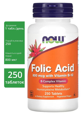 Фолиевая кислота — это очень важный член семейства витаминов группы B. Она необходима для синтеза ДНК и восстановления генетических повреждений. Нормальная выработка этого элемента важна для быстрого деления таких клеток как эритроциты. Фолиевая кислота необходима для синтеза метионина из гомоцистеина, а также она помогает поддерживать нормальную работу сердечно-сосудистой и нервной систем. Рекомендации по применению Принимать по 1 таблетке в день во время еды. Предупреждения После вскрытия упаковки хранить в сухом и прохладном месте. Предупреждение. Только для взрослых. Перед началом применения в период беременности, кормления грудью, при наличии заболеваний или приеме препаратов следует проконсультироваться с врачом. Хранить в недоступном для детей месте. Продукт может естественным образом менять цвет.
