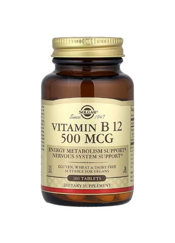 Витамин В12 цианокобаламин Solgar Vitamin B12 500 мкг 100 таб Витамин В12 цианокобаламин Solgar Vitamin B12 500 мкг 100 таб Vitamin B12 от Solgar - это высококачественная пищевая добавка, которая обеспечивает организм важным витамином B12 (цианокобаламин). Витамин B12 необходим для поддержания здоровья нервной системы, синтеза ДНК, производства энергии и кроветворения. Он способствует нормальной работе мозга, улучшению когнитивных функций и предотвращению дефицита витамина, который может вызывать анемию и усталость. Полезные свойства: Поддержка нервной системы: Витамин B12 помогает поддерживать здоровье нервов и улучшает когнитивные функции, такие как память и концентрация. Производство энергии: B12 участвует в превращении пищи в энергию, помогая снизить усталость и улучшить общее самочувствие. Кроветворение: Способствует нормальному образованию красных кровяных клеток, что важно для предотвращения анемии. Поддержка обмена веществ: Витамин B12 улучшает обмен веществ, поддерживая нормальный уровень гомоцистеина и здоровье сердечно-сосудистой системы. Поддержка иммунной системы: Витамин B12 помогает укрепить иммунитет и поддерживает общее состояние здоровья. Подходит для вегетарианцев и веганов: Особенно важен для тех, кто не получает достаточно B12 из пищи, так как витамин преимущественно содержится в продуктах животного происхождения. Улучшение настроения и сна: Поддерживает нормальный уровень энергии и способствует улучшению настроения и качества сна. Состав в одной порции (1 таблетка): Витамин B12 (в виде цианокобаламина) - 500 мкг Кальций - 130 мг Ингредиенты: Дикальций фосфат, маннит, микрокристаллическая целлюлоза, растительная стеариновая кислота, растительная целлюлоза, диоксид кремния. Рекомендации по применению Принимайте по одной таблетке в день (желательно во время еды) или в соответствии с назначением врача.