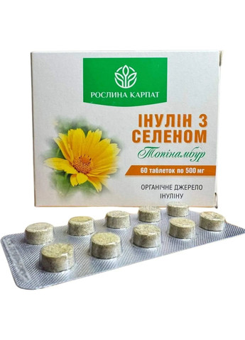 Инулин с селеном – поддержка обмена веществ и уровня сахара Инулин с селеном — это натуральное средство, сочетающее в себе инулин (природный пребиотик) и селен (важный микроэлемент) для поддержания здоровья организма, особенно при повышенном уровне сахара в крови. Препарат улучшает работу желудочно-кишечного тракта, печени, желчного пузыря и поджелудочной железы. Он также положительно влияет на суставы и щитовидную железу, нормализует обмен веществ и способствует снижению уровня глюкозы. Благодаря такому действию инулин с селеном может быть полезен людям с сахарным диабетом или тем, кто стремится снизить риск его осложнений. Назначение Способствует нормализации функций желудочно-кишечного тракта, печени, желчного пузыря и поджелудочной железы. Применение Диетическая добавка к пище при нарушениях углеводного обмена, как сахароснижающее средство при сахарном диабете, для профилактики осложнений диабета и улучшения работы пищеварительной системы. Рекомендуемая дозировка: взрослым по 2 таблетки дважды в день за 30 минут до еды, курс — 4 недели. При необходимости курс можно повторить. Состав Плоды топинамбура – 250 мг Корень цикория – 100 мг Листья пастушьей сумки – 90 мг Листья крапивы – 50 мг Селен Na – 16,1 мкг Целлюлоза – 10 мг