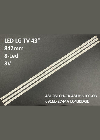Артикул: ART-12049 Тип подложки: алюминий Длина планок: 842 мм Ширина планок: 15 мм Напряжение одного светодиода: 3V Количество светодиодов на планке: 8 LED Расстояние между светодиодами по центру: 108,5 мм Расстояние между центрами крепления 30-4 -266-266 мм Маркировка планок: 43" V16.5 ART3 2744 Rev.01 1 6919L-2744A Подсветка подойдет к моделям: LG: 43LG61CH-CK, 43UH6100-CB, LC430DGE, 43L5 43LH590-ZD, 43LH590 -ZD, 43LH513V-ZD, 43LF510V, 43LH510V-ZD, 43LH590V-ZD, 43LH510V-ZE H595V-ZD, 43LH575V-ZD, 43LG61CH-CK, 43LH5100, 43LH5100CE, 43LH5100DF , 43LH5100SF, 43LH590V-ZA, 43LH510N-ZE, 43LH510T-DF, 43LH510TT-4 LH5150SE, 43LH516A-TE, 43LH518ATF, 43LH520T-TE, 43LH520V -ZB, 43LH5600ND, 43LH5600SG, 43LH5700SD, 43LH5700SJ, 43LH5700SJ, 43LH5700SJ, 43LH5700SJ, 43LH5700SJ, 43LH5700SJ H570T-TD, 43LH570V, 43LH595T-TD, 43LH5730DE, 43LH5730SE, 43LH573T-DE, 43LH576T-TD 43LF5100DA 43LF510T-DA, 43LF510T-TA, 43LF510VZA, 43LF510Y-TA, 43LF513A-TA, 43LF5700NA, 43LF5700TA, 43LF570TTA , 43LF570V-ZA, 43LF5710TB, 43UH603V, 43UH630V, 43UH6030-UD, 43UH671V, 43UH610V, 43UH603VZE, 43UH6006 43UH6107ZB, 43UH6109ZB, 43UH610NZB, 43UH610T, 43UH610TTB, 43UH610V, 43UH610VZB, 43UH611CCB, 43U53 UH617YTB , 43UH619VZC, 43UH6100, 43UH6200ND, 43UH6207ZA, 43UH620V, 43UH620VZA, 43UH6210ND, 43UH6420NL и другие. Аналоги планок: 6916L-2744A 43" V16 ART3 2564 Rev2.3 UF64_UHD_A LG Innotek Direct 43inch UHD Подсветка матрицы (панели): HC430DGG-SLNL1, HC430DUH-ABVX2 -A14X, HC430DUN-SLNX1, HC430DUN- SLNX2, HC430DUN-SLNX3, HC430DUN-SLNX4, HC430DUN-SLVX1-511X, HC430DUN-SLVX1-A1X -VAVX1-511X, LC430DGE (FJ)(M1 ), LC430DGE (FJ)(M2), LC430DGE (M4), LC430DUY-ACHA3, LC430DUY-ACHA4, LC430DGG (FJ)(M1, LC430DGG (FJ)(M2), LC430DGG NC430DUE-SADP2, NC430DUE-SADP3, NC430DUE-VUEX1, NC430DUE-VUEX3, NC430DUE-VUEX4, NC430DUE-VUEX1 ВНИМАНИЕ: Перед продажей каждая планка прошла проверку своей работоспособности с помощью. Отмечаем, что не рекомендуется использовать устройства, не предназначенные для этого, для проверки светодиодных линеек. В нашем ассортименте есть специальные устройства, предназначенные для проверки работоспособности LED-подсветки. Также рекомендуем проверить длину планок, расстояние между центрами линз, указанными в описании товара, а также убедиться, что коннектор для подключения соответствует фото и визуальному расположению крепежных отверстий. На одном телевизоре могут быть установлены различные виды планок, а также расстояние между центрами линз может не совпадать, особенно для некоторых бюджетных моделей телевизоров. Также рекомендуем проверить длину планок, расстояние между центрами линз, указанными в описании товара, а также убедиться, что коннектор для подключения соответствует фото и визуальному расположению крепежных отверстий. На одном телевизоре могут быть установлены различные виды планок, а также расстояние между центрами линз может не совпадать, особенно для некоторых бюджетных моделей телевизоров.