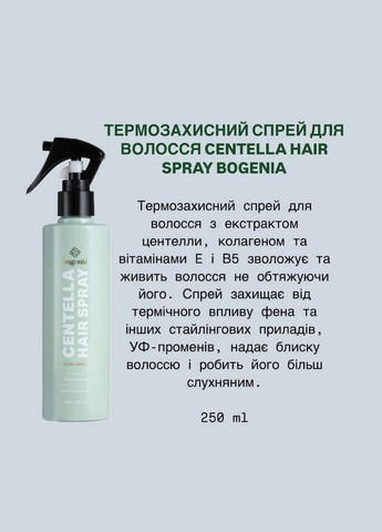 Термозащитный спрей для волос с экстрактом центеллы, коллагеном и витаминами E и В5 увлажняет и питает волосы не отягощая их. Спрей защищает от термического воздействия фена и других стайлинговых приборов, УФ-лучей, придает блеск волосам и делает его более послушным. Объем 250 ml
