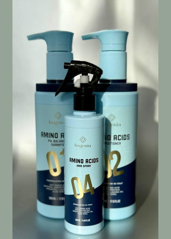 Шампунь с аминокислотами тщательно очищает кожу головы, не нарушая ее естественный баланс pH, устраняет шелушение, возвращает мягкость и блеск, не нарушает естественный гидролипидный баланс и поддерживает оптимальную увлажненность кожи. Шампунь активно питает кожу, при контакте с водой образует легкую пену, мягко устраняющую себум, пыль, загрязнение и остатки косметических средств. Подходит для чувствительной кожи головы. Применение: Смочите волосы, нанесите необходимое количество шампуня на ладонь, вспеньте, а затем распределите по волосам, тщательно помассируйте кожу головы, смойте теплой водой. Для лучшего эффекта используйте средства серии Amino Acids Bogenia. 500 мл Кондиционер с аминокислотами восстановит структуру волос, защитит от секущихся кончиков, придаст шелковистость и блеск. Кератин и Аргановое масло в составе укрепят каждую прядь изнутри. Уникальная формула помогает распутать волосы и препятствует дальнейшему спутыванию. Применение: После использования шампуня нанесите небольшое количество кондиционера на кончики волос, избегая кожи головы и корней, оставьте на 2-3 минуты, затем тщательно смойте теплой водой. Для лучшего эффекта используйте средства серии Amino Acids Bogenia. 500 мл Термозащитный спрей для волос с аминокислотами, кератином и аргановым маслом способствует надежной защите от контакта с высокими температурами и солнечным лучам. Уникальная формула восстанавливает поврежденную структуру волос, увлажняет, обеспечивает антистатический эффект. После применения продукта волосы становятся шелковистыми и гладкими, их легко расчесывать и укладывать. Применение: Нанесите на сухие или влажные волосы на расстоянии 15-20 см. Используйте перед каждой укладкой с использованием высоких температур. Для лучшего эффекта используйте средства серии Amino Acids от Bogenia. 250 мл