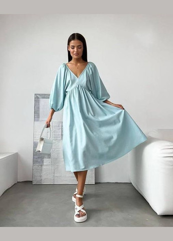 Силуэт платья — свободный и непринужденный, позволяющий чувствовать себя раскованно, а длина меди придает элегантность и изящество. V-образный вырез визуально вытягивает шею и придает образу легкого романтизма. Короткие рукава дарят свободу движений и гармонично дополняют легкость модели.