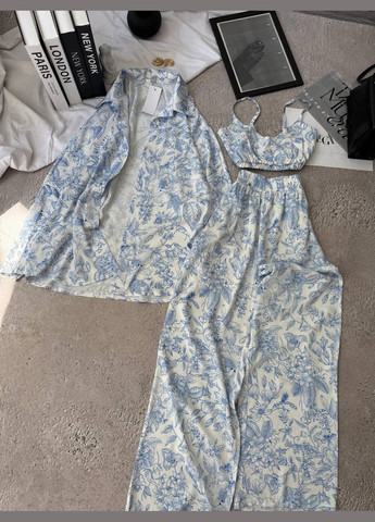 Цвет Голубой / Фасон С рубашкой, Тройка, Брючный / Стиль Повседневный / Узор Цветочный / Материал Штапель, Полиэтиленовое волокно, Шелк