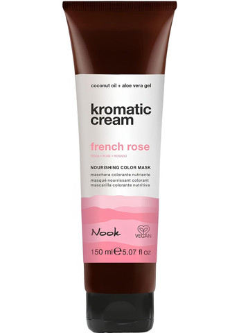 NOOK Kromatic Cream French Rose — веганская питательная маска с микропигментами нового поколения, созданная для получения утончённого пастельного розового оттенка. Идеально подходит для осветлённых или обесцвеченных волос. Маска с кислым pH глубоко ухаживает за волосами, восстанавливая мягкость, блеск и эластичность. Легко наносится и равномерно распределяется по волосам благодаря кремовой текстуре. Преимущества: Пастельно-розовый оттенок без обязательств До 95% натуральных компонентов, биоразлагаемая формула Без силиконов, спирта, парафинов, SLES/SLS Подходит для обесцвеченных и натуральных волос Лёгкое применение даже без опыта Ключевые активные компоненты: Кокосовое масло — питает и укрепляет Алоэ вера — увлажняет и придаёт блеск Глюконат натрия — защищает от металлов и загрязнений Аромат: Верхние ноты: альдегидные ноты, зеленые листья Ноты сердца: клубника, ежевика, ваниль Базовые ноты: кедр, белый мускус Для кого: Для любителей пастельных розовых тонов, ценящих мягкий уход и временный цвет без ущерба для волос. Результат: Нежный розовый тон и блестящие, мягкие волосы.