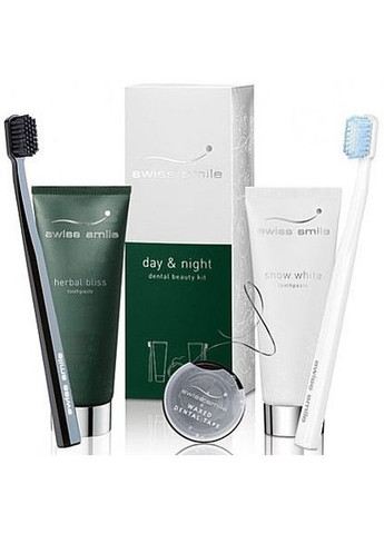 Описание Набор для восстановления и отбеливания зубов "День и ночь" - Swiss Smile Day & Night Dental Beauty Kit Snow White Toothpaste + прозрачная зубная щетка - Swiss Smile Snow White Toothbrushes + восстановительная зубная паста, 75 мл - Swiss Smile Herbal Bliss Toothpaste + черная зубная щетка Swiss Smile Herbal Bliss Toothbrush + упаковка Between Waxed Dental Tape В набор известного швейцарского бренда Swiss Smile входят отбеливающая зубная паста, прозрачная зубная щетка, восстановительная зубная паста, черная зубная щетка и упаковка зубной нити на 70 метров. Они помогают обеспечить полости рта качественный уход, улучшают состояние и внешний вид зубов. Отбеливающая зубная паста, 75 мл - Swiss Smile Snow White ToothpasteВ составе отбеливающей зубной пасты есть сбалансированно подобранные уходовые компоненты, благодаря которым продукт обеспечивает полноценный уход за зубами. Экстракты алоэ вера, куркумина, микроэлементы диоксида титана и пищевая сода бережно влияют на зубную эмаль, не повреждают ее, при этом активно расщепляют и удаляют абсолютно все загрязнения и зубной налет. Специальные полировальные дольки и активные компоненты интенсивно освещают эмаль, устраняют желтизну и следы от табака, кофе и вина, делая улыбку идеально белой. Паста также обеспечивает эффективный антибактериальный эффект и противовоспалительное действие. Инновационная зубная щетка отлично отбеливает зубы без всякого вреда для эмали. Щетина изготовлена из специального волокна Curen, имеет закругленные кончики, предотвращает образование микротрещинок и болезненных ощущений в процессе использования. На поверхности щетинок есть уникальные микроочистительные частицы, что позволяет щетке идеально удалять все загрязнения и налет, полировать поверхность зубов, делая улыбку белой и очаровательной. Инновационная щетина поглощает меньше влаги по сравнению с другими щетками, поэтому она долгое время не теряет свою форму и начальные свойства. Также вас обязательно порадует эргономичная форма и элегантный дизайн щетки. Восстановительная зубная паста, 75 мл - Swiss Smile Herbal Bliss Toothpaste Восстановительная зубная паста содержит экстракты эдельвейса, эхинацеи, зеленого чая и хлорофилла, благодаря чему она обеспечивает комплексный уход за зубами, способствует их оздоровлению. Ценный комплекс полезных компонентов обладает выраженным укрепляющим действием, успокаивает воспаленные десны, восстанавливает бактериальный баланс полости рта. Паста идеально очищает загрязнение, зубной налет и пятна, обладает нежным травяным вкусом, поэтому пользоваться этим продуктом не только полезно, но приятно и комфортно. Черная зубная щетка Swiss Smile Herbal Bliss Toothbrush Зубная щетка Swiss Smile Herbal Bliss Toothbrush предназначена для эффективного ухода за чувствительными зубами и деснами. Экстрамягкая щетка состоит из большого количества щетинок, которые превышают их стандартное количество в семь раз! Щетина изготовлена из высококачественного волокна Curen, она поглощает меньше влаги по сравнению с другими щетками, поэтому изделие не потеряет свою форму и начальные свойства слишком долго. Густо набитая щетка обеспечивает идеальную очистку даже в труднодоступных местах, при использовании не вызывает неприятных или болезненных ощущений. Аксессуар оснащен удобной эргономичной ручкой, имеет стильный вид и невероятно удобен в использовании. Упаковка 70 г зубной нити Swiss Smile In Between Waxed Dental TapeНавоскованная зубн