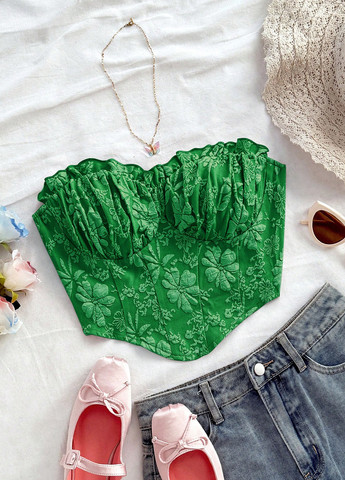 Комплект состоит из трех элементов: укороченной кофты, топ-бандо и брюк с декоративными заклепками по бокам. Кофта на молнии, с контрастным кантом, хорошо подчеркивает талию и придает образу спортивной динамики. Топ-бандо держится на мягкой эластичной резинке, что обеспечивает удобство и уверенную посадку без лишних деталей. Брюки имеют свободный крой и дополнены яркими металлическими заклепками вдоль боковых швов, что создает эффектный акцент и придает современности.