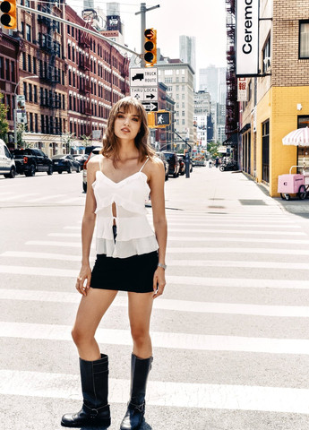 Легкий топ из невесомого шифона на тонких бретелях. Длина бретелей регулируется. Лиф с многослойными рюшами на завязке.
