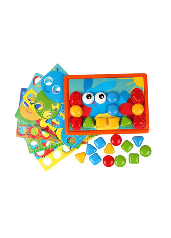 Мозаика состоит из ярких разноцветных пластиковых деталей (26 шт), разных цветов. С помощью мозаики можно собирать разнообразные предметы, растения, животных и т.д. Комплект состоит из:26 кнопок, 6 трафаретов.