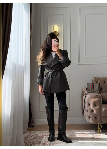 Для тренчу вибрали гладку та м'яку екошкіру. Тренч на підкладі, застібається на об'ємні ґудзики. Модель доповнена оригінальними декоративними елементами – відлітні кокетки по переду і спинці, погони на плечах.