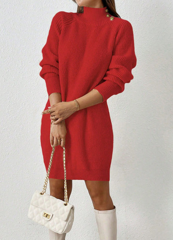 SHEIN Платье-свитер французской вязки в рубчик. Изготовлено из трикотажной ткани в рубчик. Свободный крой с естественной линией талии. Длина мини и прямой низ. Воротник-стойка с декоративными пуговицами. Рукава до запястья и заниженная линия плеча.