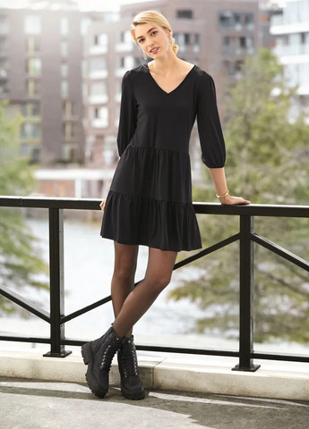 Платье в классическом черном цвете представляет собой незаменимую часть гардероба, которая может стать основой для многочисленных стильных образов. Модель длиной миди с круглым вырезом изготовлена ​​из трикотажа, что обеспечивает идеальный баланс для талии и бедер. Универсальный дизайн платья делает его отличным выбором как для повседневной носки, так и для важных событий. Свободный крой с боковыми разрезами подчеркнет вашу фигуру, придавая образу женственности и элегантности.