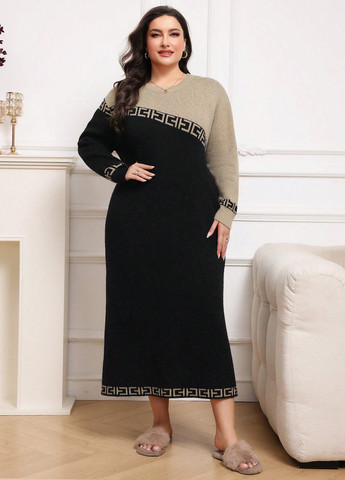 Это трикотажное платье-свитер с геометрическим узором и цветовым блоком. Оно имеет V-образный вырез и естественную талию. Платье имеет длинные рукава и свободный крой. Ткань обладает средней эластичностью. Подол имеет прямую форму.
