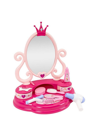 Косметический столик со стулом ТехноК – идеальная игрушка для маленьких принцесс и модниц, мечтающих о своей личной красивой зоне. Этот набор позволит детям чувствовать себя настоящими косметологами и перевоплощаться в стильных визажистов и парикмахеров. Особенности: 1. Красивый сказочный дизайн: Косметический столик изготовлен из качественных материалов, имеет стильный и волшебный дизайн. Привлекают внимание отлично подобранные цвета. 2. Функциональность: Столик оснащен большим безопасным зеркалом, которое позволит детям наблюдать за своим видом и наносить макияж, делать друг другу прически. Он также имеет удобные отделения и ящики для хранения аксессуаров, чтобы все было организовано и легко доступно. Стул имеет удобную форму для комфортного использования. В комплекте столика кроме трюмо и стула есть расческа, щетка, зеркальце, пинцет, заколка-гребешок, плойка, пудреница, фен, тюбик крема - всего 9 аксессуаров. 3. Развитие навыков Этот косметический столик и стул способствуют развитию воображения, творчества и социальных навыков у детей. Они могут имитировать процесс нанесения макияжа, примерить аксессуары и надеть различные косметические аксессуары, что будет способствовать их развитию и веселому игорному опыту. 4. Безопасность: Мы уделяем особое внимание безопасности наших маленьких пользователей. Косметический столик и стул изготовлены из безопасных материалов. Это идеальный подарок для маленьких красавиц!