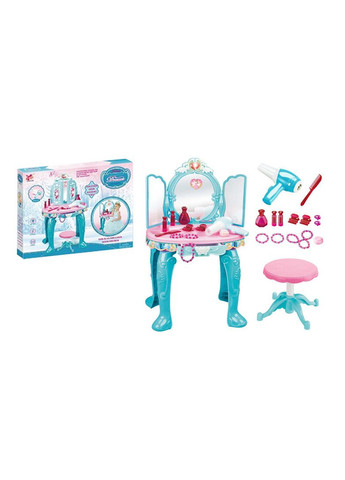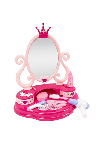 Этот стильный столик имеет большое наполнение, которое позволяет вашему ребенку играть в стилиста или парикмахера, делать прически и макияж. В комплекте столика кроме трюмо есть расческа, щетка, зеркальце, пинцет, заколка-гребешок, плойка, пудреница, фен, тюбик крема – всего 9 аксессуаров.