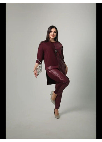 Костюм состоит из удлиненной туники и лосин. Он выполнен из комбинации двух материалов: качественной двунити и экокожи. Это сочетание придает изделию оригинальность и трендовый вид. Туника имеет асимметричный крой с интересной вставкой из экокожи, а лосины оснащены удобным поясом на резинке, что обеспечивает идеальную посадку. Также в комплекте идет подвеска, дополняющая образ.