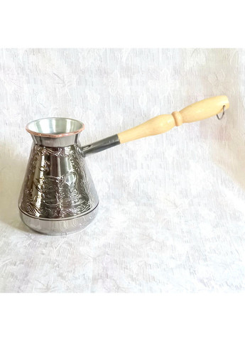 Турка медная "Козаки" 500 мл (полный объем до краев) изготовлена из высококачественной листовой меди толщиной 1,2 мм. Внутри посуда покрыта пищевым оловом толщиной 9-12 мкм, что предохраняет медь от окисления и делает изделие максимально безопасным для здоровья. Пищевой припой оловом необходим для того, чтобы в кофе не ощущался недопустимый металлический привкус (лужение для джезвы нужно обязательно, чтобы не было химического процесса окисления и дальнейшего разрушения поверхности из меди). Внутреннее лужение выполняется электрохимическим методом и олово на молекулярном уровне оседает на поверхности меди в чистом виде (Sn3). Наружное покрытие турки – "чёрный никель". Это поверхностное гальваническое покрытие выполняет декоративно-защитную роль и позволяет изделию иметь отличный внешний вид даже после длительной эксплуатации. Длинная деревянная ручка позволит избежать ожогов; это особенно важно для тех, кто готовит кофе на открытом огне. Выполнена она из ольхи, а сверху покрыта влагостойким лаком. При перегреве ручка не отделится от изделия, поскольку она отпрессована на медной трубке, а затем пропаяна с помощью винтово-паечного способа. Также на конце ручки есть скоба для подвешивания турки. Краткие характеристики изделия: высота – 115 мм диаметр горлышка – 65 мм диаметр дна – 75 мм длина ручки – 165 мм Медь – лучший материал для посуды, в которой готовится кофе. Ведь медь отлично проводит тепло, равномерно распределяя нагрев по всей поверхности сосуда. Благодаря этому ваш любимый напиток приобретает полный, насыщенный вкус и аромат, мягкую пенку и замечательные бодрящие свойства. Привкуса пригоревшего кофе, наоборот, удастся избежать. Рекомендации по обслуживанию: используйте только моющие средства из натуральных ингредиентов без отдушки!