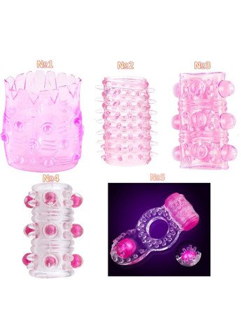 Набор из пяти силиконовых рельефных насадок выполнен из качественного и экологичного материала, который имеет прекрасную эластичность и может хорошо растягиваться в длину и диаметре, что позволяет использовать их на любой размер пениса или вибратора. Насадки имеют форму "рукава", что позволит размещать их на любом участке пениса/вибратора по вашему желанию. Насадки из набора сделают пенис более крупным и рельефным. Ребра, мягкие точки и нежные усики, касаясь клитора и влагалища женщины, унесут ее в мир наслаждения. А эрекционное виброкольцо, входящее в набор, позволит повысить Вашу эрекцию за счет вибрации и значительно продлить половой акт, за счет снижения оттока крови из-за плотно прилегающего к пенису кольца. Эластичные рельефные насадки на член используются для дополнительной стимуляции влагалища во время проницаемого полового акта, усиления эрекции у мужчин и значительного продолжения полового акта. Также насадки могут использоваться при одевании на вибратор, чтобы значительно изменить его форму и подарить Вам новые ощущения при использовании Вашей любимой игрушки. В набор входит: Насадка в форме распускающегося цветка, с нежными лепестками и усиками (вид.N1). Насадка с ребрами и нежными усиками (вид.N2) Насадка с ребрами, мягкими пузырьками и нежными усиками (вид.N3) Насадка с ребрами, твердыми шариками и мягкими усиками (вид.N4) Эрекционное кольцо с вибромотором, нежными усикаами и шариком для стимуляции клитора (вид.N6). Батарейки уже входят в комплект. Обратите внимание, что цвет насадок входящих в комплект может быть разным (розовый, белый (прозрачный), фиолетовый, голубой). Вы можете уточнить у менеджера дополнительную информацию о возможности приобретения изделий определенного цвета. Цвет: белый (прозрачный), розовый, фиолетовый, голубой. Перед и после использования вымойте изделие теплой водой с мылом. Рекомендуем использовать со смазкой лубрикантом на водной основе.