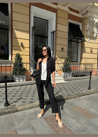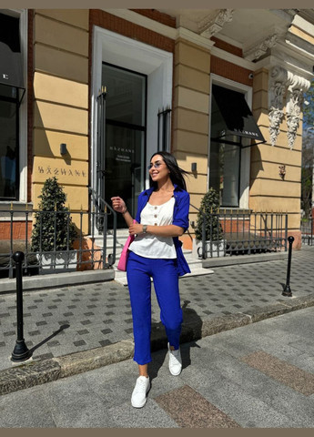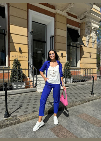 Женский костюм-двойка включает в себя блузу с разрезами по бокам и брюки со средней талией. Блуза украшена декоративными клапанами на груди, а рукав является трансформером, который можно носить укороченным или полным. Брюки имеют эластичный пояс сзади и стильные отвороты внизу. Этот костюм идеально подходит как для активного дня, так и для стильного вечера. Ткань из американского крепа (жатка).