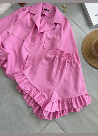 Нежный костюм - настоящее произведение стиля и женственности. Комплект состоит из укороченного жакета с запахом и завязками на талии, которые эффектно подчеркивают фигуру, и мини-юбки с воланом по низу, которая добавляет игривости образу.