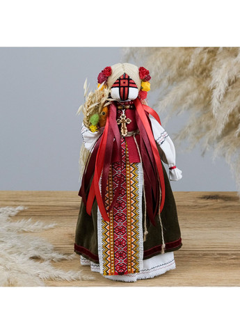 Мотанка — оберег, созданный без лица, символизирующий чистоту, связь с предками и защиту от злых сил. Крест на лице – знак гармонии между духовным и земным. Кукла-мотанка мини в красном платочке высотой 14 см — произведение ручной работы, олицетворяет любовь к традициям. Она одета в красный платок, красную рубашку и черную юбку с мелким цветочным орнаментом. Белый передник с красным швом придает образу чистоплотности и завершенности. Ее сложенные руки символизируют молитву, покой и внутреннюю силу. Значение цветов Красный цвет считается одним из сильнейших защитных символов — он олицетворяет жизненную энергию, любовь, силу рода и очищающий огонь. Белый цвет ассоциируется с чистотой, духовностью, светом и гармонией, он передает искренность намерений и связь с небесным миром. Черный, несмотря на распространенные стереотипы, в контексте мотанки несет значение глубины, стабильности, мудрости и памяти предков. Сочетание этих цветов создает баланс между телесным, духовным и родовым, превращая куклу в настоящий оберег, что не только украшает пространство, но и наполняет его защитой, гармонией и эмоциональной глубиной. Кому можно подарить Такая кукла станет прекрасным подарком на Рождество, Пасху, Ивана Купала, именины, день рождения, свадьбу или новоселье. Она подойдет как подарок для женщины, девушки, мамы, бабушки, коллеги, учителя или ребенка, ведь несет положительную энергетику, гармонию и добрые пожелания. Мотанка — не просто украшение, а оберег, сохраняющий уют в доме, поддерживает душевное равновесие и напоминает о глубине украинских корней. Ее можно поставить на полку, рабочий стол или подарить как часть этнического декора. Такой подарок всегда будет кстати, искренним и наполненным содержанием. Количество в упаковке 1 шт. Количество в ящике 1 шт.