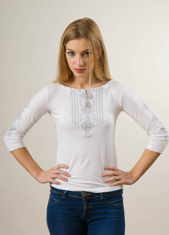 Аккуратная вышитая футболка белым по белому - это эталон нежности и женственности. Красивый геометрический орнамент на рукавах и груди создан на основе образцов традиционной украинской вышивки. Серебряная вышивка прекрасно выделяется на белом фоне и создает настроение сдержанности и женской силы. В вышивке заложен оберег ромб, который защищает от разной нечисти. Главный узор вышивки расположен в зоне декольте, так как требовали наши предки, чтобы защищать сердце. В основе вышитой футболки использована белая ткань с вискозы и эластина. Она приятная к телу, легкая, и деформируется после стирки.