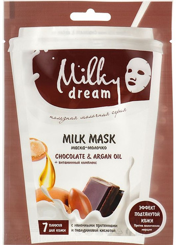 Milky Dream – украинский бренд, отличающийся полезной молочной серией тканевых масок. Они обеспечивают эффективный уход за кожей любого типа, помогают справиться с определенными проблемами и улучшить ее состояние, гарантируют эффективное воздействие. Устранить морщины, придать коже гладкость, эластичность и упругость поможет тканевая маска «Шоколад и масло аргании». Ее формула отличается интенсивными питательными, увлажняющими, витаминизирующими, разглаживающими и тонизирующими свойствами, которые обеспечивают видимые результаты сразу после 1-го применения средства. обогащенной гиалуроновой кислотой, молочными протеинами, витаминным комплексом, маслом аргании и маслом какао; - обеспечивает интенсивное питание кожи; - оказывает глубоко увлажняющее действие; - активизирует процесс клеточного обновления; - разглаживает микрорельеф эпидермиса; - уменьшает выраженность мимических; подтягивающий эффект; - повышает тонус кожного покрова; - не допускает возникновения сухости и шелушения; - освежает лицо.