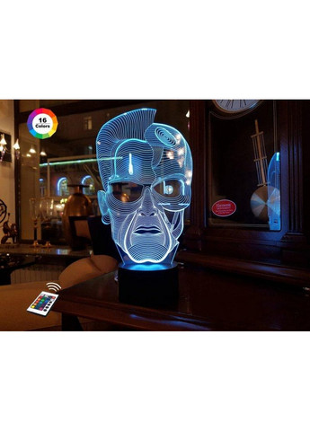 3D ночник Терминатор (УВЕЛИЧЕННОЕ ИЗОБРАЖЕНИЕ) подарочная упаковка + 16 цветов + пульт ДУ + сетевой адаптер+ батарейки (3ААА) 3DTOYSLAMP 3D стветильники-ночникиторговой марки3DTOYSLAMPс эффектом трехмерного изображения станут отличным дополнением любого интерьера. Простое управление.Цвет свечения меняется нажатием на кнопку на корпусе, а так же при помощи пульта ДУ. Есть режим автоматического перекючения цветов и возможность регулировать яркость подсветки ночника. Безопасность.Светильник ненагревается, не имеет запаха. Работа от батареек и сети.3D светильник Терминатор может работать от сети, компьютера или power-банка, а так же от батареек (микропальчиковые 3 шт)ИДУТ В КОМПЛЕКТЕ. Управление с помощью пульта: Направьте пульт в сторону базы. Нажмите ON для включения, OFF для выключения лампы. Яркость свечения регулируется с помощью кнопок со стрелочками вверх/вниз. Для выбора цвета свечения нажмите на кнопку соответствующего цвета. FLASH смена цвета по порядку. STROBE смена цвета в случайном порядке. FADE цвета меняются с эффектом затухания. SMOOTH плавная смена цвета. Вам понравилось несколько дизайнов 3D ночников и не знаете какой выбрать?Возможно вашему ребенку понравился другой мультяшный герой или Вы изменили интерьер в вашем помещении? Не обязательно покупать новый ночник! Уникальной особеностью 3D ночников является то, что изображенияв нем съемные. В нашем магазине представлен большой ассортимент сменных пластин.Достаточно заказать у нас дополнительное изображение - и у Вас новый 3D ночник! характеристики: Цвет света:16цветов свечения Материал:акрил, пластик Размер:27х15см Мощность:5 Вт Комплектация:подарочная упаковка,корпус, акриловая пластина ( УВЕЛИЧЕНОЕ ИЗОБРАЖЕНИЕ), пульт ДУ, USB- кабель 1.5 м , сетевой адаптер,батарейки (3ААА),инструкция на украинском языке Гарантия:12 месяцев Ресурс лампы:до 50 000 часов работы МАТЕРИАЛЫ НЕ СОДЕРЖАТ ВРЕДНЫх ВЕЩЕСТВ! НЕ НАГРЕВАЕТСЯ! БЕЗОПАСНО ДЛЯ ДЕТЕЙ! Вся продукцияторговой марки3DTOYSLAMPпрошла тщательную проверку на качество!