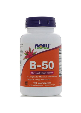 NOW B-50 включает комплекс витаминов группы B в сочетании с другими компонентами для быстрого усвоения организмом.Мультивитаминный комплекс создан для поддержания здоровья организма во время физических нагрузок, развития авитаминоза, для скорейшего восстановления после травм и операций.Витамин B12 можно получить от употребления в пищу мясных и молочных продуктов. Поэтому ежедневное применение B-50 особенно полезно для вегетарианского меню.Как принимать:Принимают по одной капсуле ежедневно во время еды.Содержание элементов в 1й порции1 вегакапсулаВитамин В1 50 мгВитамин В2 50 мгВитамин В3 50 мгВитамин В4 25 мгВитамин В5 50 мгВитамин В6 50 мгВитамин В7 50 мкгВитамин В8 25 мгВитамин В9 667 мкгВитамин В10 25 мгВитамин В12 50 мкгИнгредиентыЦеллюлоза (капсула), порошок целлюлозы, диоксид кремния и стеарат магния (растительный источник)