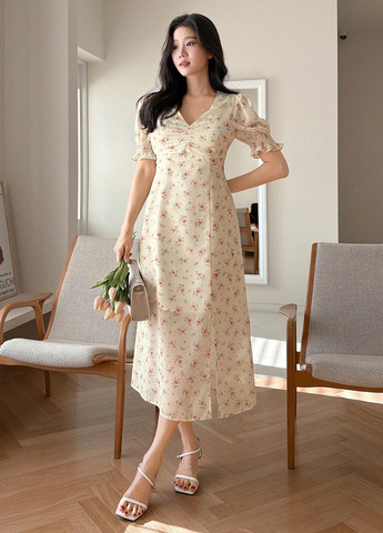 Женское платье-миди DAZY с цветочным принтом. Платье с V-образным вырезом, рукава-фонарики. Подходит для торжественных и вечерних мероприятий.