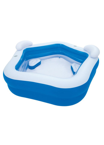 Бассейн надувной детский Bestway 54153 Большой, удобный надувной бассейн Bestway для всей семьи, в котором могут разместиться несколько взрослых и детей. Для заполнения бассейна требуется приблизительно 575 л воды. Конструкция состоит из 2 надувных колец, изготовленных из крепкого винила, в синем и белом цветах. Это придает ему привлекательный внешний вид и стойкость к повреждениям. Надувной бассейн с аксессуарами для комфорта Бассейн оснащен надежным предохранительным клапаном от выхода воздуха. Он обеспечивает дополнительную сохранность и долговечность использования. Для максимального комфорта плавание бассейн Bestway поставляется со встроенными аксессуарами. К ним относятся 2 отсека для напитков, 2 надувные подушки для головы и 2 надувные сиденья. Вы можете удобно разместиться всей семьей и расслабиться с любимыми напитками. Размеры садового бассейна размеры бассейна примерно 213 x 206 x 69 см, емкость примерно 575 л, толщина материала 0,27 мм, вес примерно 5,5 кг. Комплектация надувной бассейн для детей, ремонтная заплата, красочная упаковка.
