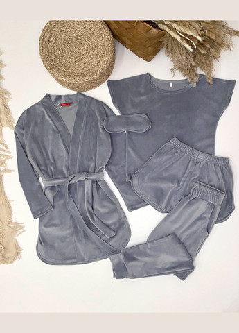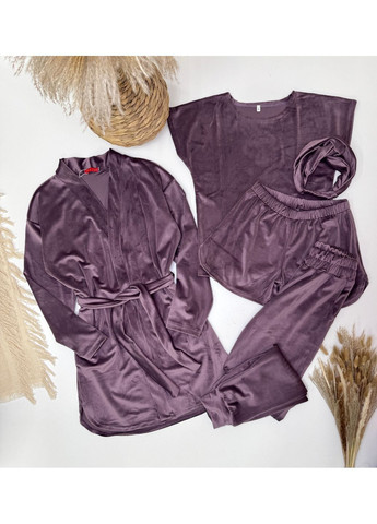Комплект из трех единиц - укороченный топ, шорты и халат на поясе. Выполнен набор из велюрового материала с элементами кружева.
